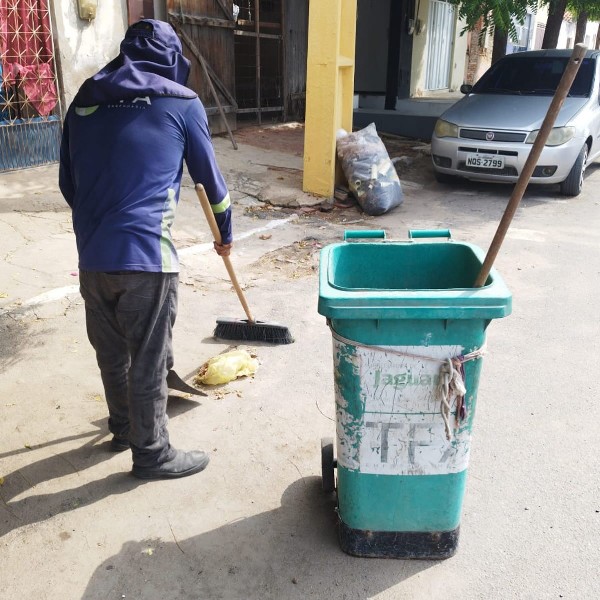 O serviço é feito com vassourão, garantindo a retirada de areia e resíduos sólidos, além do uso de ciscadores em áreas com grama ou em espaços onde o vassourão não alcança.