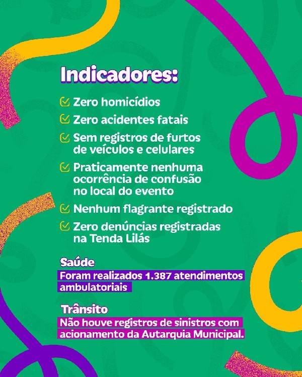 Vivemos dias de festa com tranquilidade, cuidado e responsabilidade, mostrando que é possível celebrar com paz e respeito. Os indicadores refletem o compromisso de toda uma equipe que trabalhou para garantir um evento acolhedor para moradores e visitantes.