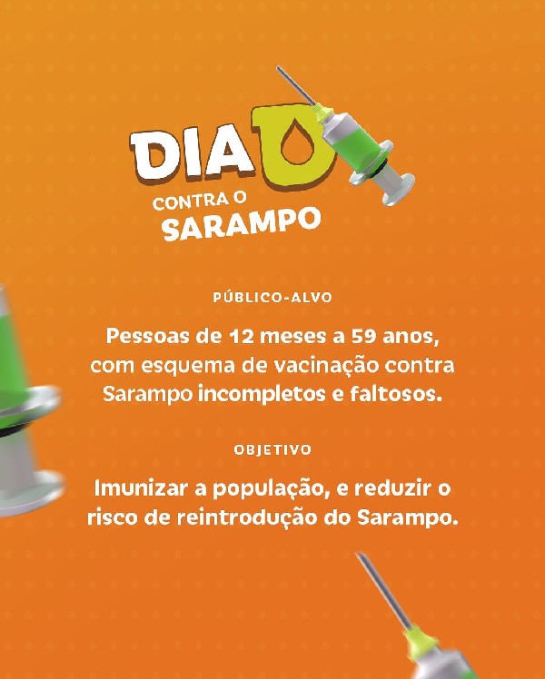 A Secretaria de Saúde comunica que amanhã, sexta-feira (3), é o Dia D contra o Sarampo, com mutirão de vacinação nos PSFs Cardeais, Tabuleiro, Borges, São José e Patos. Não fique de fora!