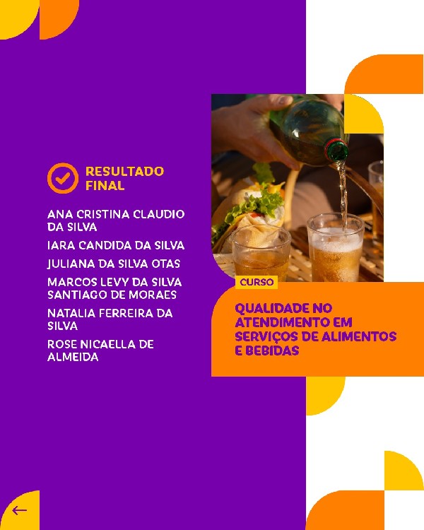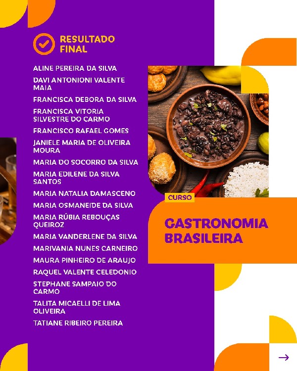 Lista de inscritos nos cursos de Gastronomia Brasileira(60h) e Qualidade no Atendimento em Serviços de Alimentos e Bebidas (40h).
