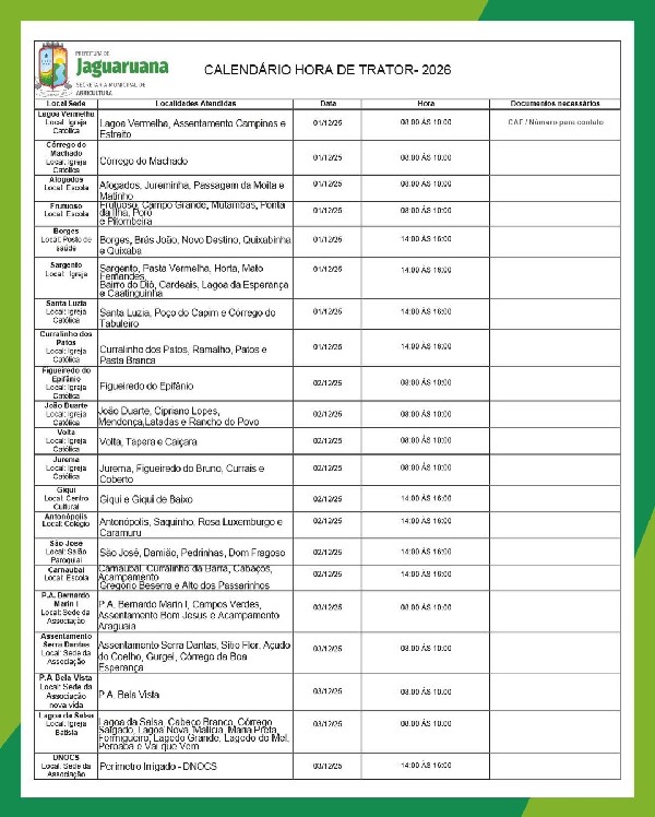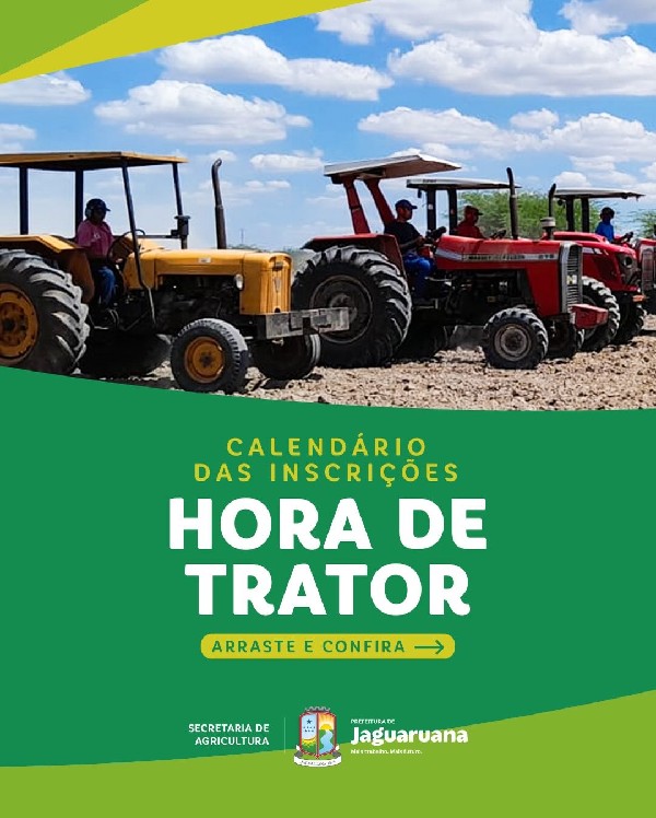 A Secretaria de Agricultura da Prefeitura de Jaguaruana comunica o calendário de inscrições para o programa Hora de Trator. Confira o cronograma.