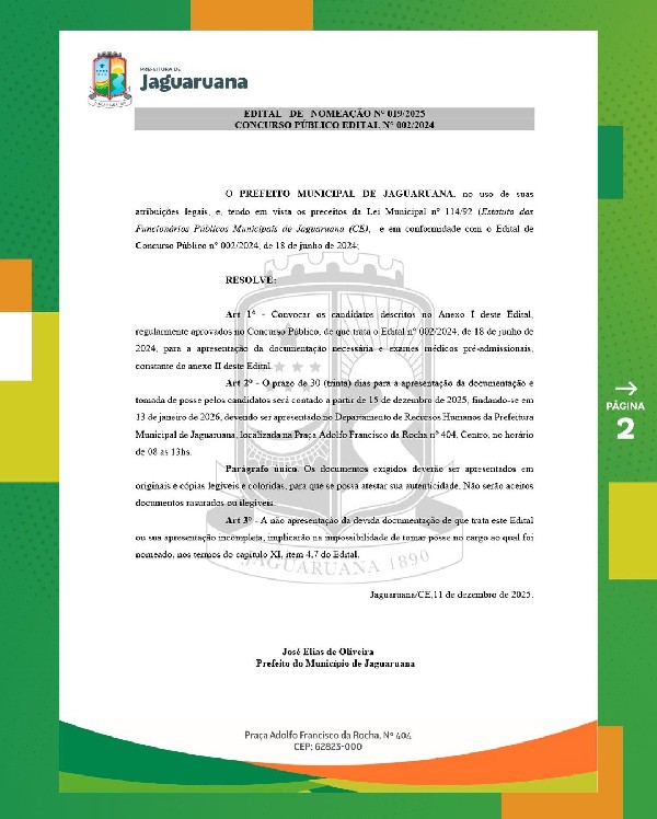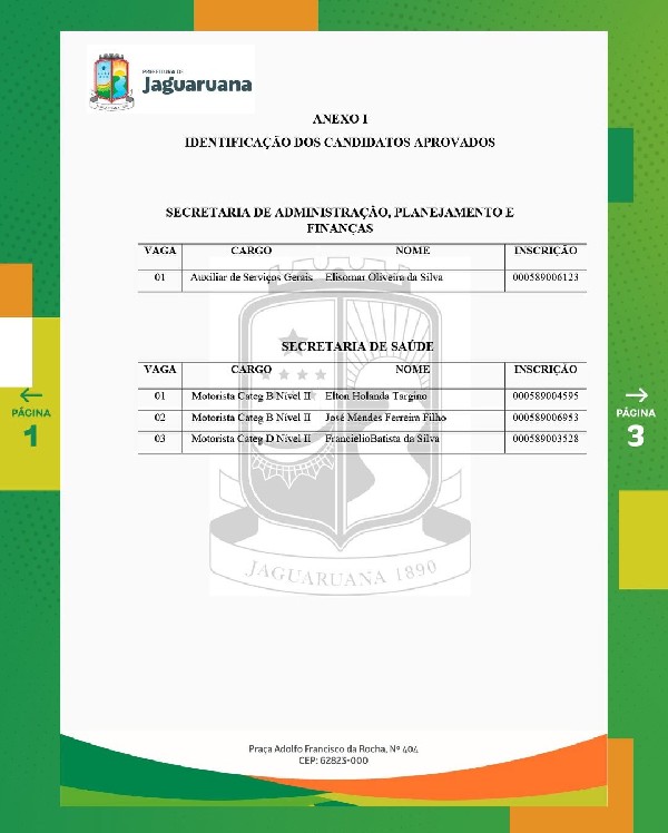 Edital de convocação referente ao concurso público da Prefeitura de Jaguaruana para a Secretaria de Administração, Planejamento e Finanças.