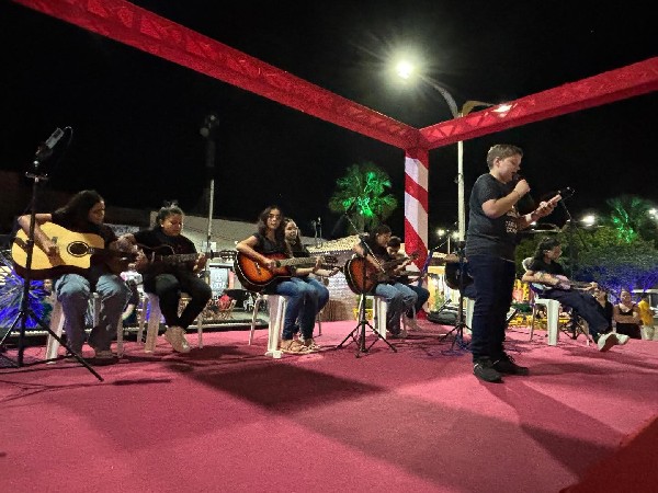 O Natal está chegando e a Secretaria da Cultura e Turismo da Prefeitura de Jaguaruana promoveu uma noite bem especial, neste domingo (14), na praça Adolfo Francisco da Rocha, no Centro. Teve muito som com os alunos do projeto Teclas e Cordas, além de canto e violão com Armazém Musical.