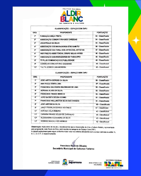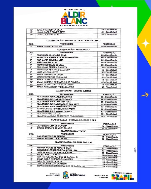 A Prefeitura de Jaguaruana, por meio da Secretaria de Cultura e Turismo, torna público o resultado final da Política Nacional Aldir Blanc de Fomento à Cultura.
