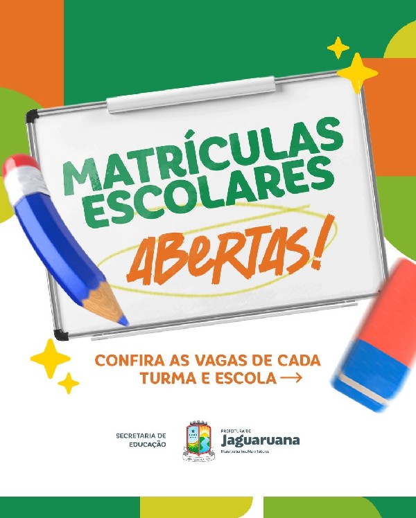 A Secretaria de Educação da Prefeitura de Jaguaruana comunica que as matrículas para o ano letivo de 2026 estão abertas! Fique atento às vagas disponíveis para novatos em turmas e unidades de ensino da rede pública.
