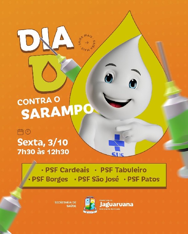 A Secretaria de Saúde comunica que amanhã, sexta-feira (3), é o Dia D contra o Sarampo, com mutirão de vacinação nos PSFs Cardeais, Tabuleiro, Borges, São José e Patos. Não fique de fora!