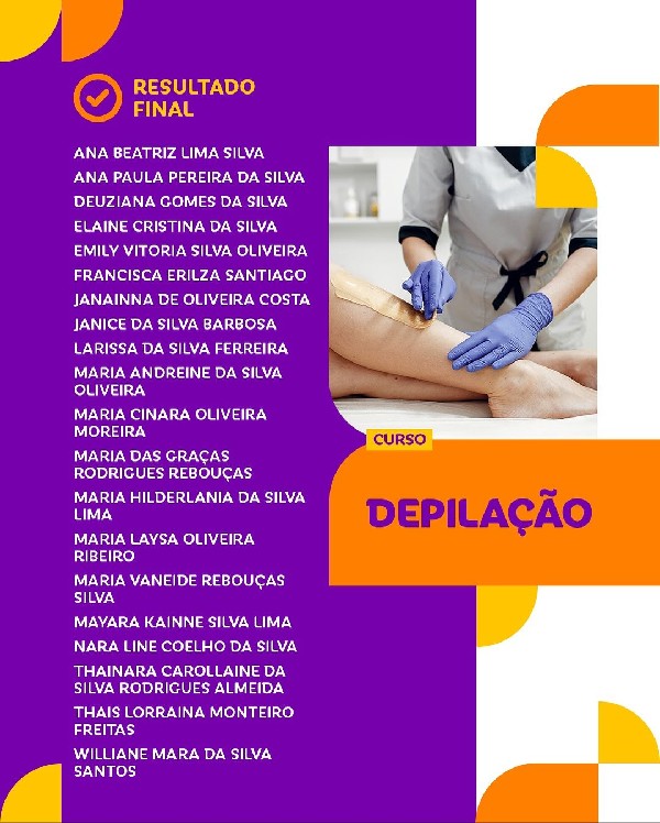 A Secretaria de Assistência Social da Prefeitura de Jaguaruana informa a lista de inscritos para o curso de Depilação do Programa Transformando Líderes. As aulas terão início nesta terça-feira (14).