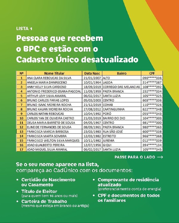 Compareçam nesta segunda-feira (13) na Sede do Cadastro Único para atualização ou inclusão do cadastro, munidos dos documentos de todos os integrantes da família.