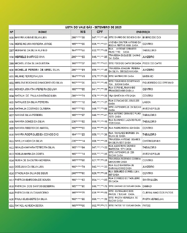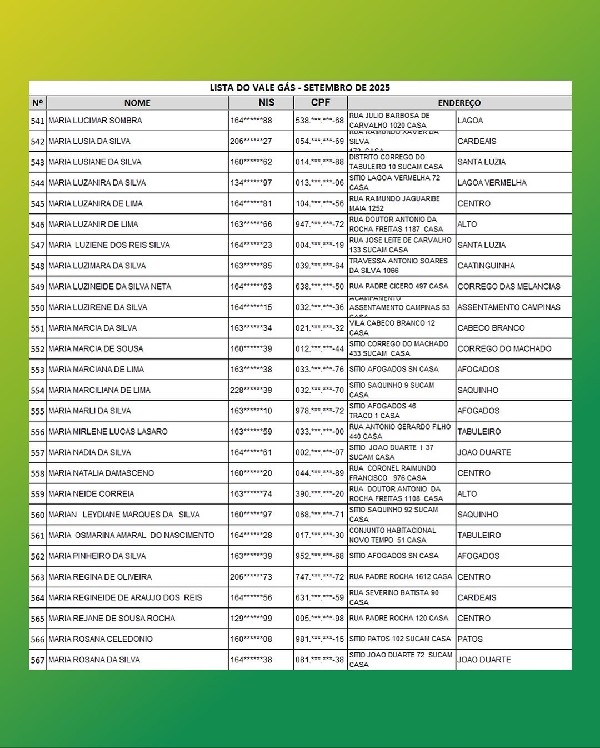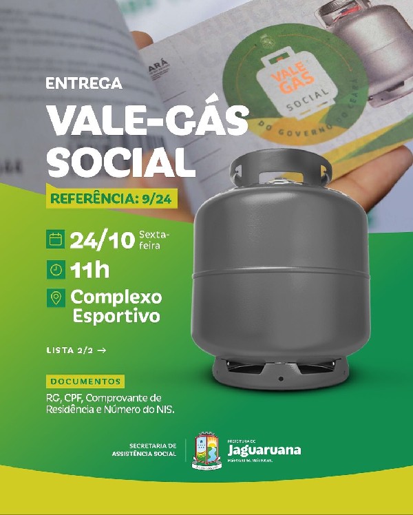 A Secretaria de Assistência Social da Prefeitura de Jaguaruana comunica que haverá mutirão de entrega dos tíquetes do programa Vale Gás Social, do Governo do Ceará, nesta sexta-feira (24), no Complexo Esportivo. Confira a lista 2.