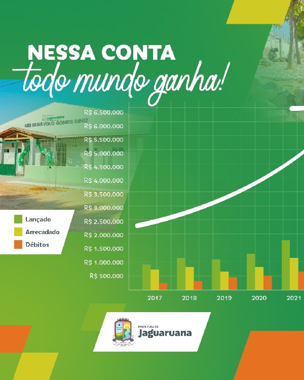 Mais credibilidade e respeito às contas públicas garantiram um cenário perfeito ao aumento da arrecadação nos últimos anos no município de Jaguaruana. Escolas reformadas e de qualidade, mais espaços públicos, salários em dia tudo isto - e muito mais - só é possível com uma organização que assegure arrecadação, responsabilidade e aplicação do dinheiro no lugar certo. É com transparência que seguimos trabalhando para que Jaguaruana cresça cada vez melhor, com mais trabalho e mais futuro.