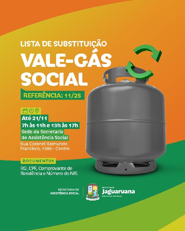A Secretaria de Assistência Social da Prefeitura de Jaguaruana informa que até o dia 21 de novembro, os nomes que foram substituídos à lista do Programa Vale Gás Social devem procurar a pasta para a retirada do tíquete. Confira a lista e compareça!