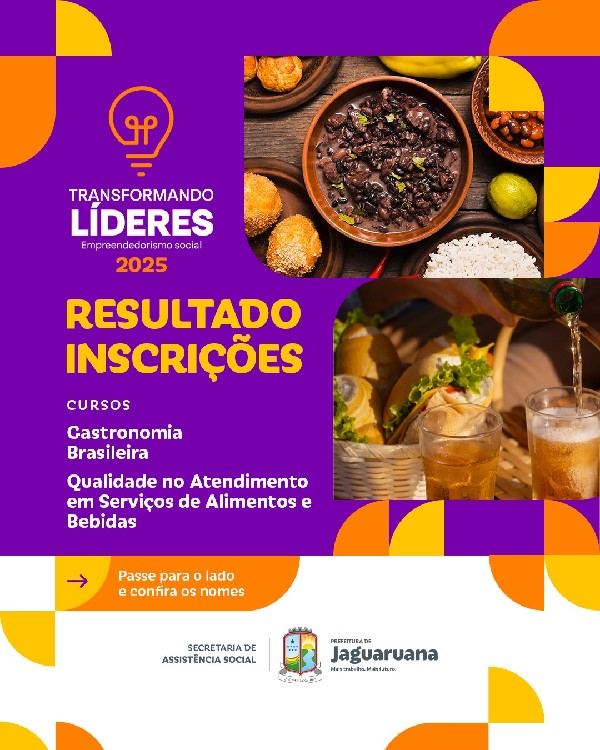 A Secretaria de Assistência Social da Prefeitura de Jaguaruana comunica a lista de inscrições nos cursos de Gastronomia Brasileira (60h) e Qualidade no Atendimento em Serviços de Alimentos e Bebidas (40h), do programa Transformando Líderes.