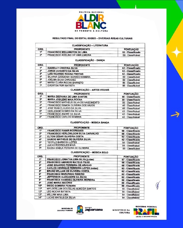 A Prefeitura de Jaguaruana, por meio da Secretaria de Cultura e Turismo, torna público o resultado final da Política Nacional Aldir Blanc de Fomento à Cultura.