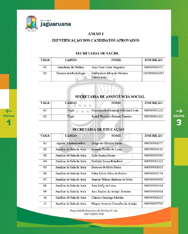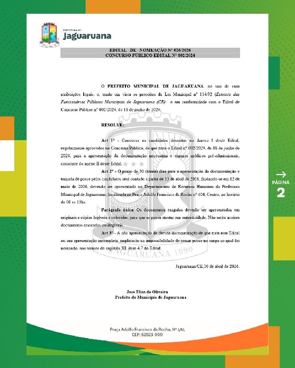Concurso Público nº 002/2024! Os candidatos nomeados têm até 12 de maio de 2026 para entregar a documentação e realizar os exames pré-admissionais no RH da Prefeitura (Praça Adolfo Francisco da Rocha 404 Centro), das 8h às 13h. Consulte o Anexo I!