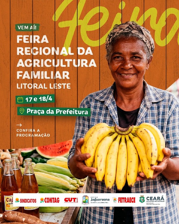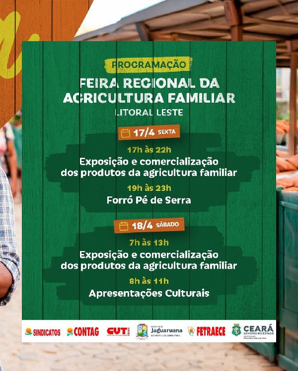Uma realização da Secretaria de Agricultura da Prefeitura de Jaguaruana em parceria com CONTAG, CUT Ceará, Fetraece, Sindicatos e o Governo do Estado do Ceará. Valorize quem produz o alimento na mesa do nosso povo!