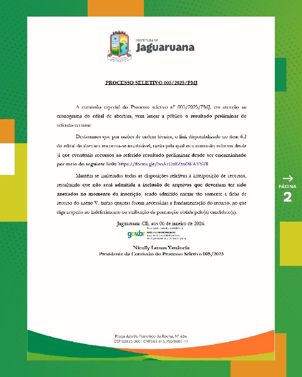 A Prefeitura de Jaguaruana divulgou no site oficial, no último dia 6 de janeiro, o resultado preliminar do processo seletivo para contratação de servidores públicos em caráter temporário. Confira.